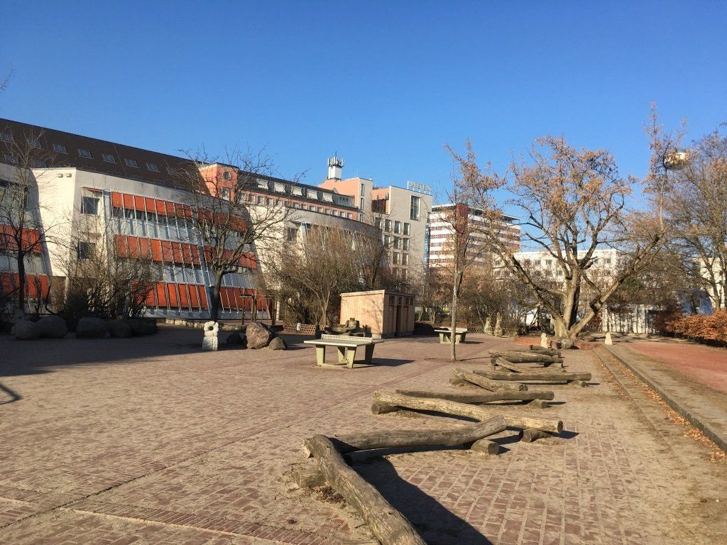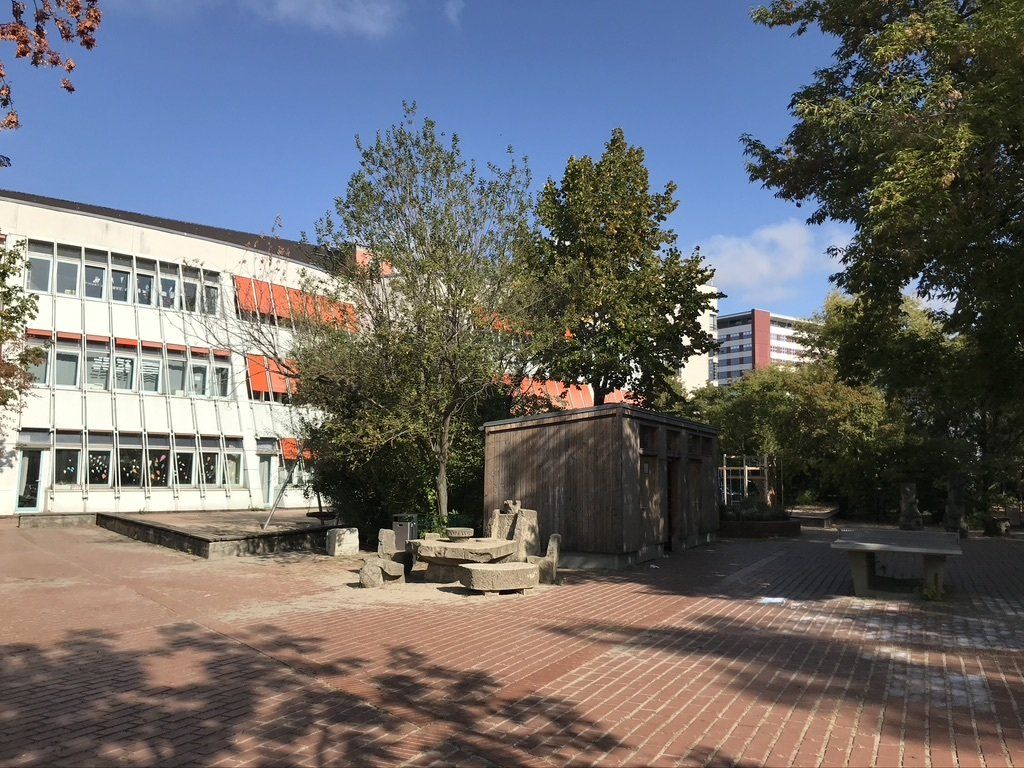 Versteckt hinter der Backsteinfassade liegt unser großer und grüner Außenbereich. Unsere ehemaligen Sechstklässler haben ihre Spuren in Form von Steinskulpturen auf ihm hinterlassen. Neue Klettergerüste, die Nestschaukel und unser Spielehaus lassen in den Hofpausen keine Langeweile aufkommen. Unser Schulhof verfügt außerdem über einen Teich, eine Kräuterspirale, ein kleines Wildbiotop und ein Insektenhotel. Unsere schuleigenen Bienen werden liebevoll von der Bienen-AG betreut. Das Besondere an dem Schulgelände ist unser wunderschöner, großzügiger Schulgarten mit seinen Obstbäumen, der sich über zwei Terrassen hinweg erstreckt.
